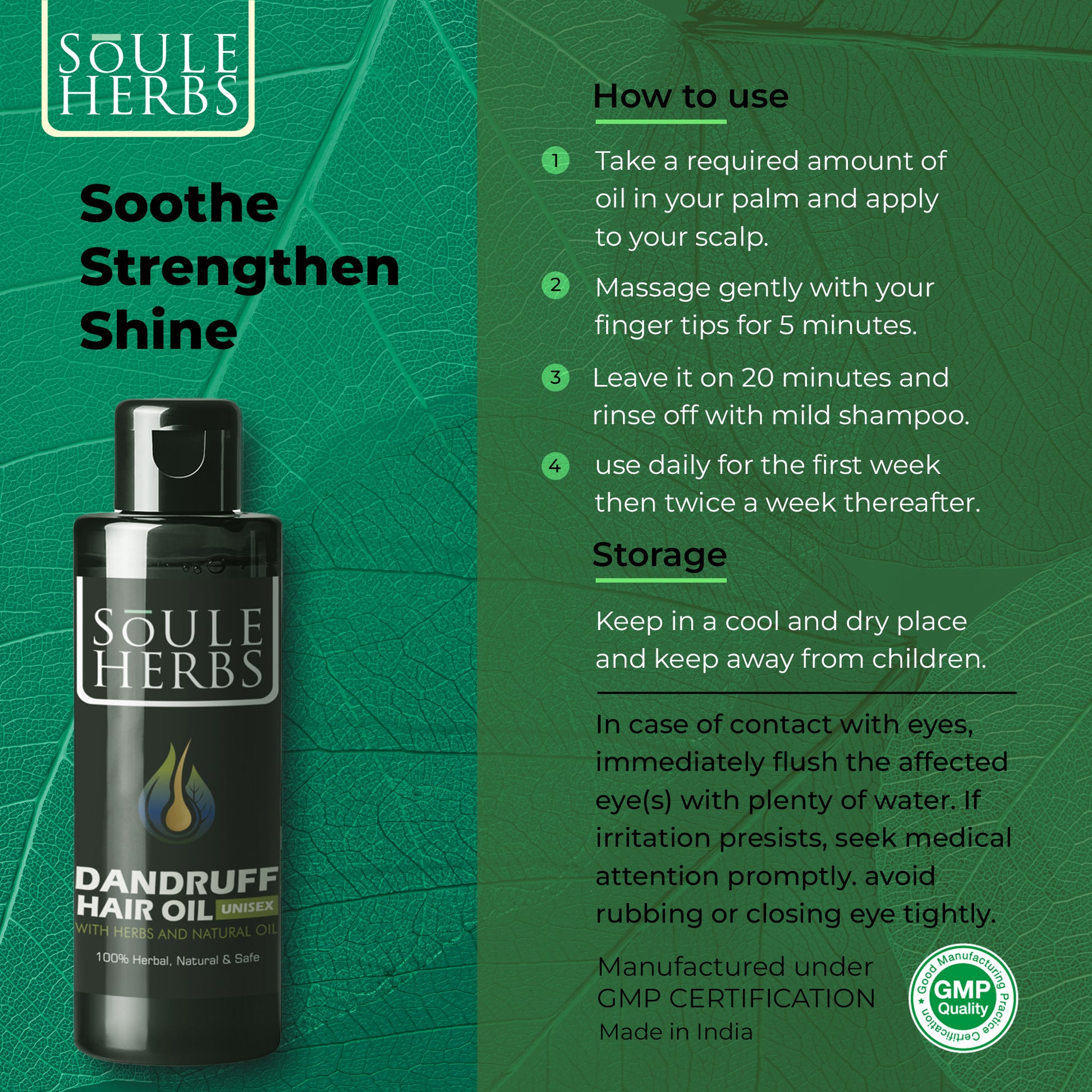 Soule Herbs Pre-Shampoo Dandruff Hair Oil has anti-inflammatory properties that reduce redness, swelling, or scalp irritation, which could contribute to hair fall and dandruff.